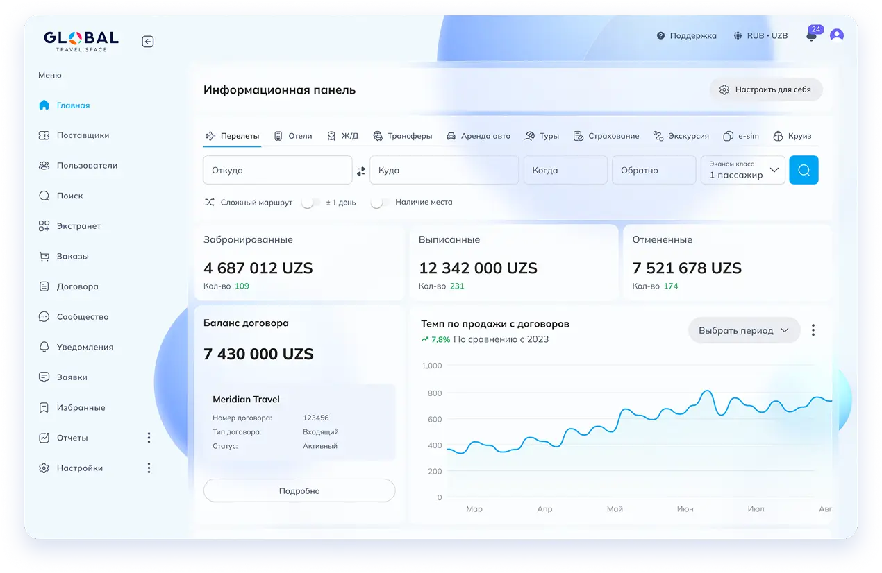 Global Travel Space — технологическая система нового поколения для консолидаторов, туроператоров и DMC. Она объединяет бронирования, цены, чартерные программы и аналитику в одном интерфейсе.